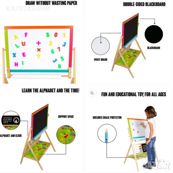 Образователният статив има поставка за тебешири, флумастери, моливи и пастели. Тебеширите и флумастерите са включени в комплекта. И двете страни на дъската разполагат с почистваща повърхност, за да могат децата лесно да започват следващия си шедьовър. Има включена гъбичка за почистване.
