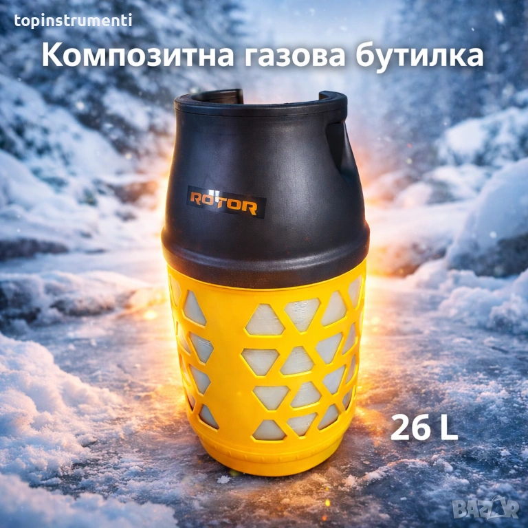 Газова бутилка композитна 26 л. ъглов кран с резба, ROTOR за къмпинг / каравана