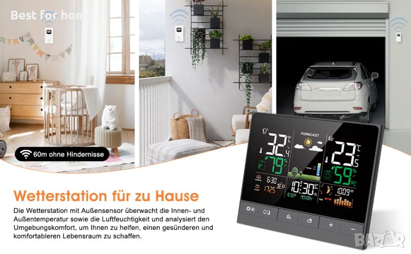 3. Безжично предаване на сигнал до 60 m: Външният сензор/външният термометър директно показва температурата и влажността, той е устойчив на пръски, така че може да се постави и под покрива (но не под дъжда). Всяка базова станция е съвместима с максимум 3 външни сензора (но поръчката съдържа само един), радиовръзката е стабилна и може да достигне до 60 m при липса на досадни препятствия.