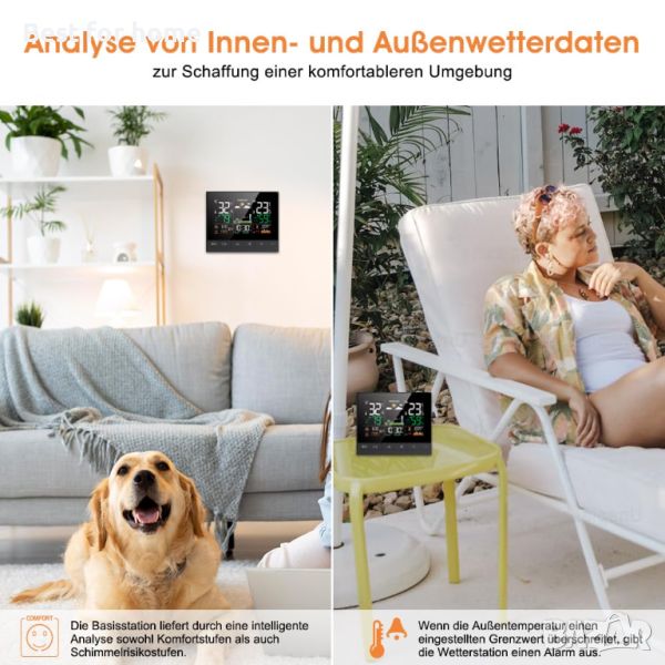 5. Подходяща за множество сценарии: В зависимост от вашите нужди, метеорологичната станция може да бъде поставена на масата (по-препоръчително) или окачена на стената и е подходяща за всекидневна, спалня, бебешка, детска стая, балкон, градина, заден двор, офис/конферентна зала/заседателна зала, оранжерия, вино/изба за съхранение и много други. Тази метеорологична станция, която допринася за по-здравословна и по-комфортна среда, е незаменим добър помощник за вашето семейство и най-добрият подарък за вашата любов.