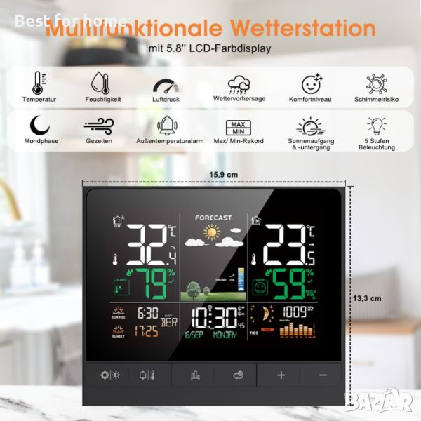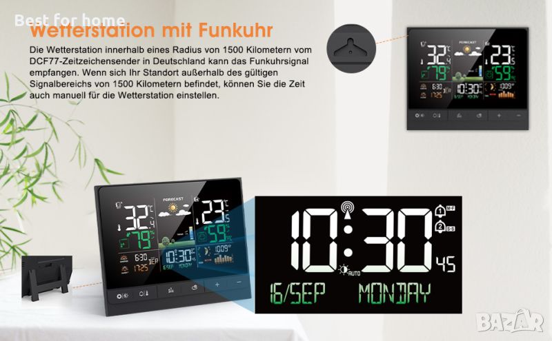 1. Радиоуправляем часовник с метеорологична информация: многофункционалната метеорологична станция предоставя по-точни данни в реално време: 1 радиочасовник (немски DCF радиосигнал на часовника се получава автоматично); 2 будилника с режим на дрямка; 3 вътрешна/външна температура и влажност с тенденции и максимум/мин запис; ④ регулируема аларма за външна температура; 5 ниво на комфорт и риск от мухъл на закрито; 6 изгрев/залез, лунна фаза. Вашият град Въздушно налягане и прогноза за времето; Нощен режим за осветление и др.