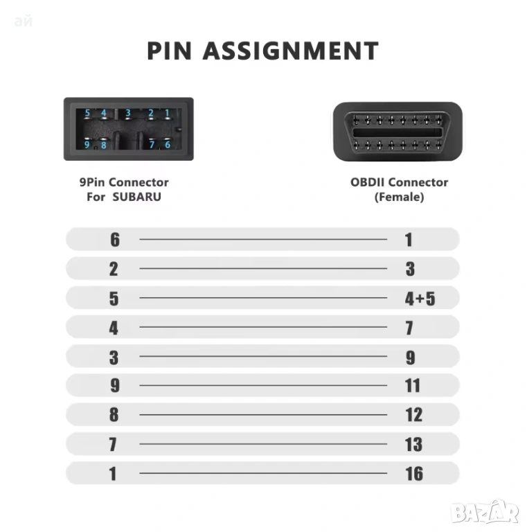 Преходникът / Кабелът SUBARU 9 PIN е предназначен за диагностика на автомобили от марката Subaru, които използват 9-пинов диагностичен конектор. Този кабел ви позволява да свържете диагностичното си устройство директно към автомобила, осигурявайки стабилна и надеждна връзка за извършване на диагностични проверки, четене и изтриване на грешки, и следене на живи данни.