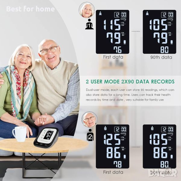 Двама потребители имат свои собствени независими записи на измервания, всеки потребител може да запише до 90 измервания. Помага на потребителите лесно да записват своето кръвно налягане и сърдечен ритъм според конкретния час и дата за последващо гледане.