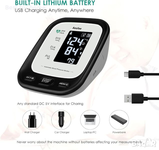 Апарат за измерване на кръвно налягане Aesfee Горна част на ръката USB акумулаторна, точна автоматична машина за кръвно налягане и пулсомер 22-36 см регулируем маншет, 2×90 комплекта памет, LCD дисплей с подсветка
