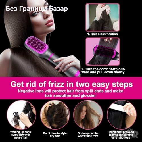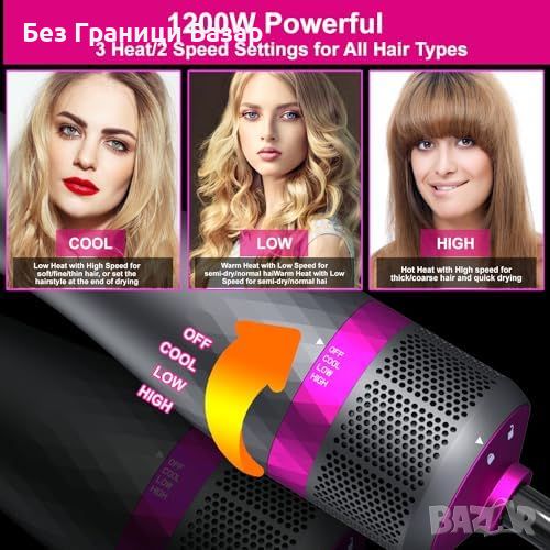 Нов 3 в 1 Сешоар Четка за Коса Изправяне и Обем 1200W Негативни Йони и 4 Приставки
