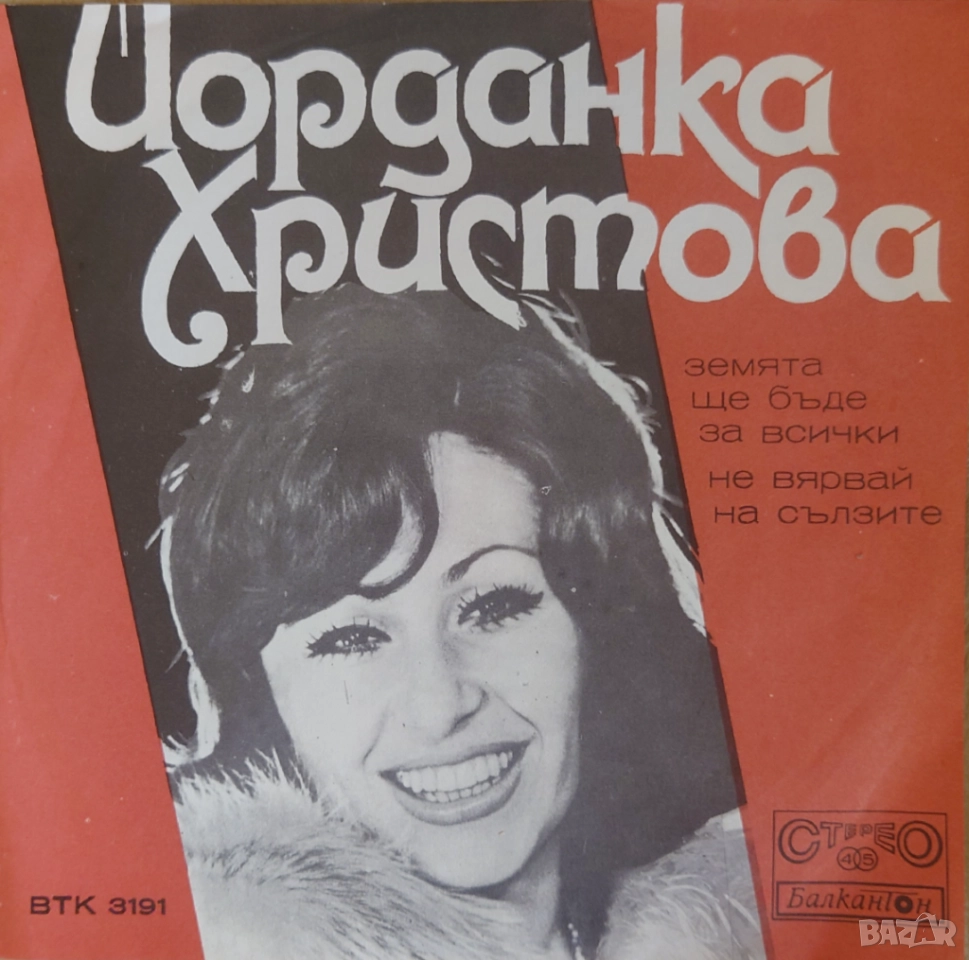 Йорданка Христова – Земята ще бъде на всички 7" сингъл ВТК 3191 в отлично състояние, с оригинална обложка. Цена 6.00 лева.