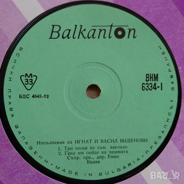 Игнат Виденов, Васил Виденов – Изпълнения на Игнат и Васил Виденови 7" сингъл ВНМ 6334 в отлично състояние, с обложка. Цена 5.00 лева.