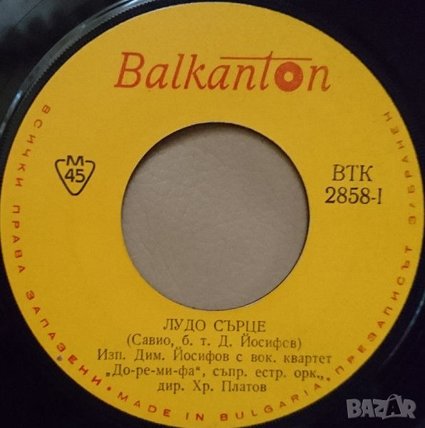 Димитър Йосифов с вокален квартет „До-Ре-Ми-Фа“ – Лудо сърце / Сто милиона или левче 7" сингъл ВТК 2858 в отлично състояние, с обложка. Цена 6.00 лева.