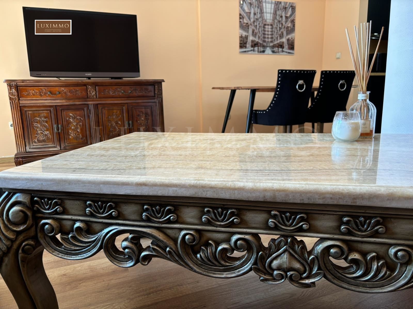 Южен просторен хол с трапезария и кухня, обзаведен с висок клас мебели и уреди;