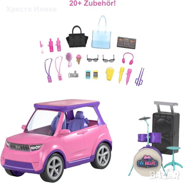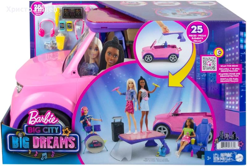 Готови ли сте за шоу на път? Закопчайте две кукли Barbie® (куклите се продават отделно), след това паркирайте и трансформирайте автомобила, за да построите сцената за вълнуващо представление! Блестящият розов SUV е със свалящ се покрив, който се превръща в сцена, свалящи се седалки, които се превръщат в места за публика и над 20 аксесоара, включително комплект барабани със столче, високоговорител, грамофон, микрофони и др. Бъдещите звезди на възраст над 3 години могат да мечтаят за всякакви големи приключения с този трансформиращ се автомобил Barbie®!