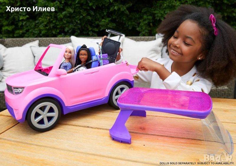 С този блестящ розов и лилав SUV с място за две кукли Барби (продават се отделно), децата могат да изглеждат страхотно по всяко време и навсякъде.
