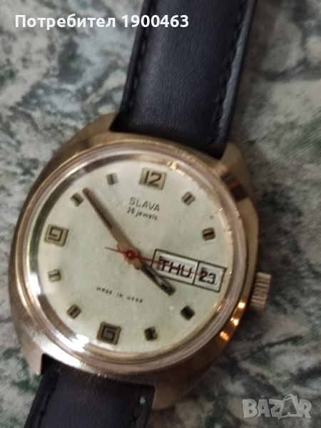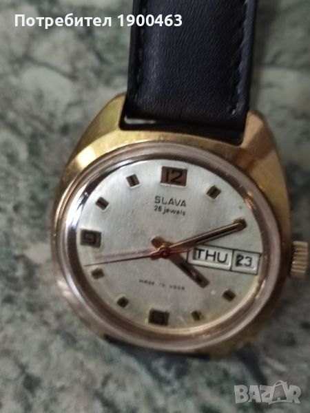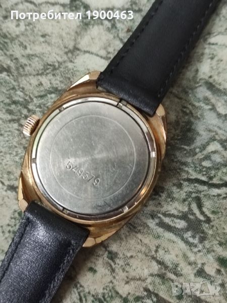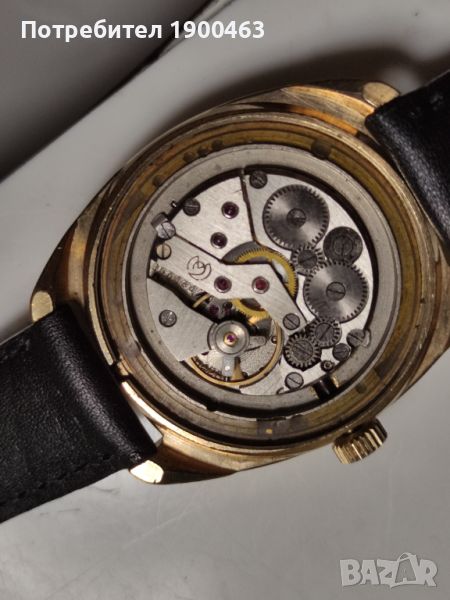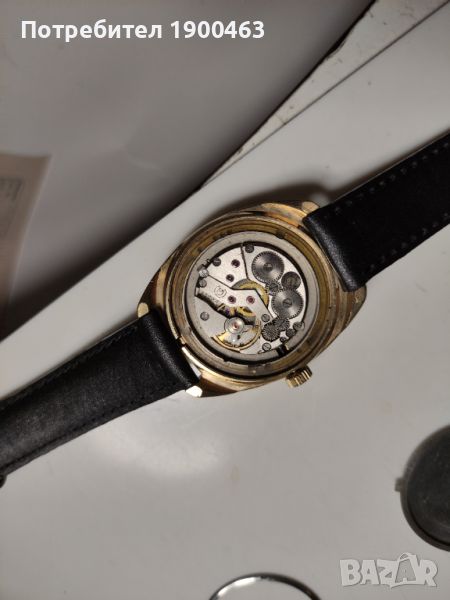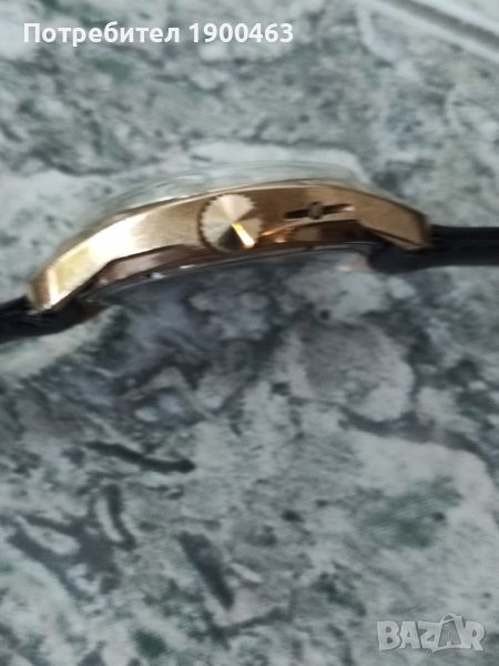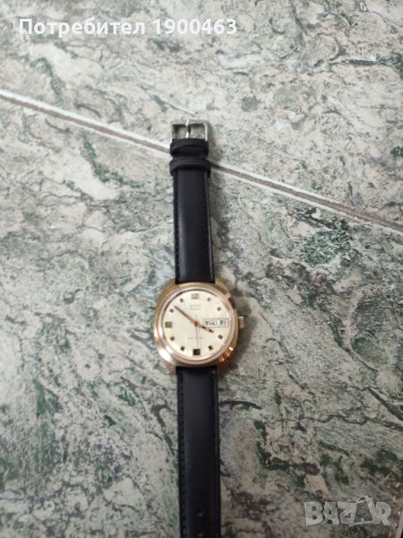 Отлично работещ механичен часовник ръчно навиване произведен през 80 те години в СССР.Дата ден от седмицата на 3часа.Бутон за автоматично прехвърляне на датата.Диаметър без коронката 36мм.Дебилина на позлатата 10 микрона.Нова каишка.