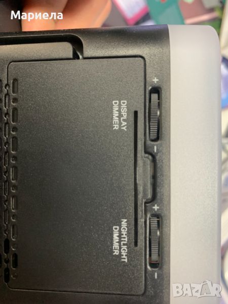 Ясен LED цифров дисплей с 0-100% регулиране на яркостта чрез плъзгащо се колело. Има 3 нива на сила на звука на алармата и режими 12/24, от които можете да избирате, и може да се активира режим на дрямка за 9 минути. Може да се поддържа с 3 * AAA батерии .