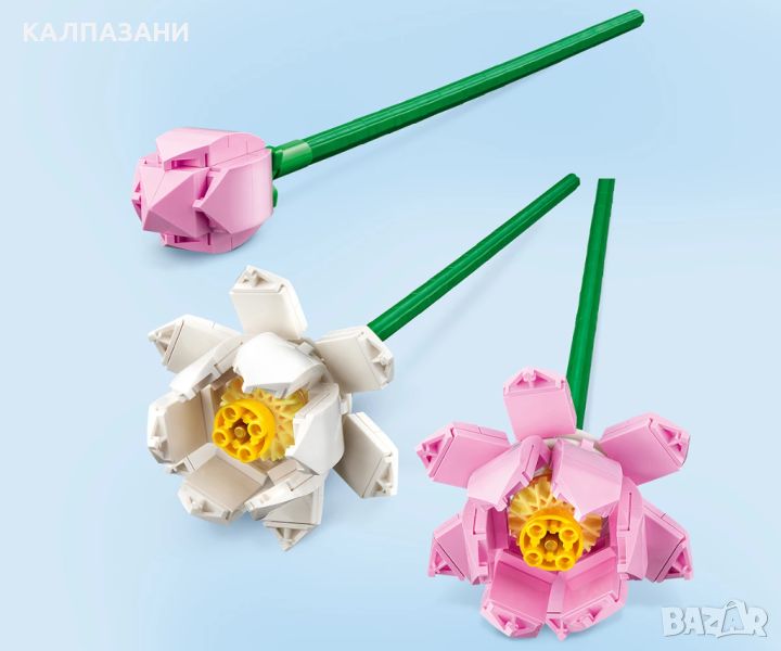 Пресъздайте чудо на природата с комплекта LEGO® Лотоси (40647). Интерпретацията от LEGO на световно известното цвете изобразява 2 напълно цъфнали лотоса, плюс цветна пъпка, всички в деликатни нюанси на розово и бяло, с дълги зелени стъбла за излагане на показ във ваза. Красивият букет от LEGO е страхотна идея за подарък за рожден ден, празник или друг повод и може да се комбинира с други комплекти с цветя LEGO за конструиране (продават се отделно).