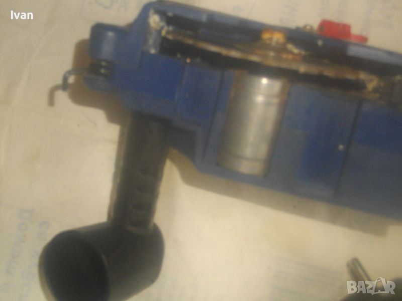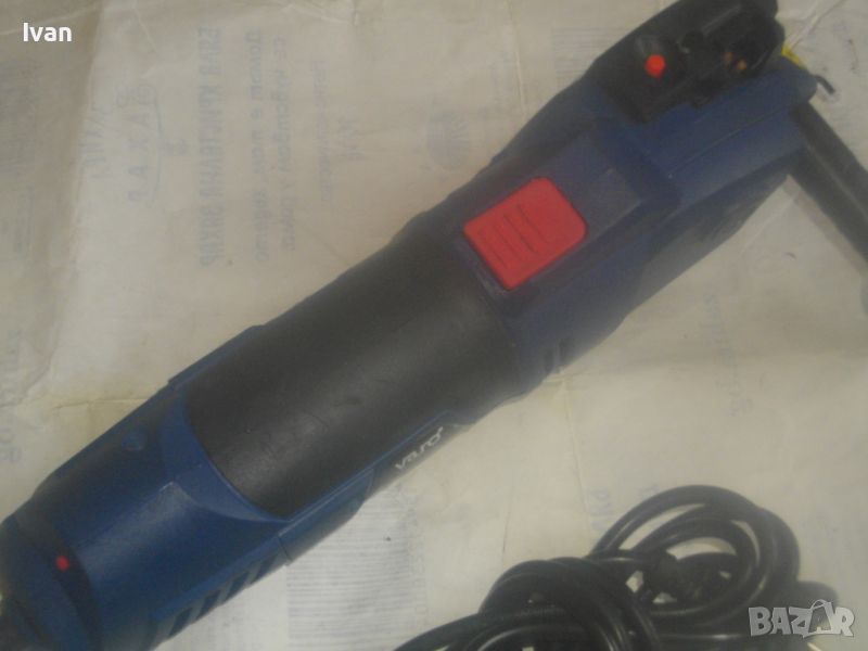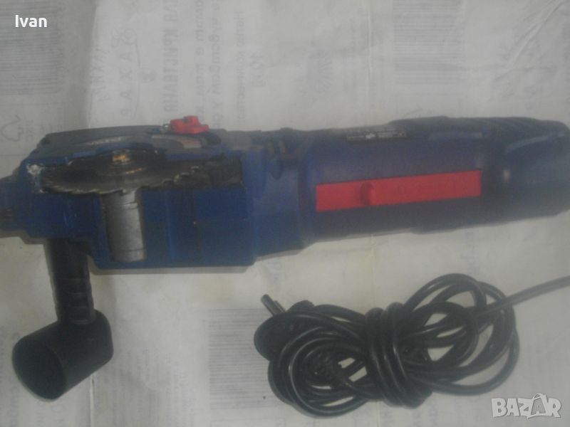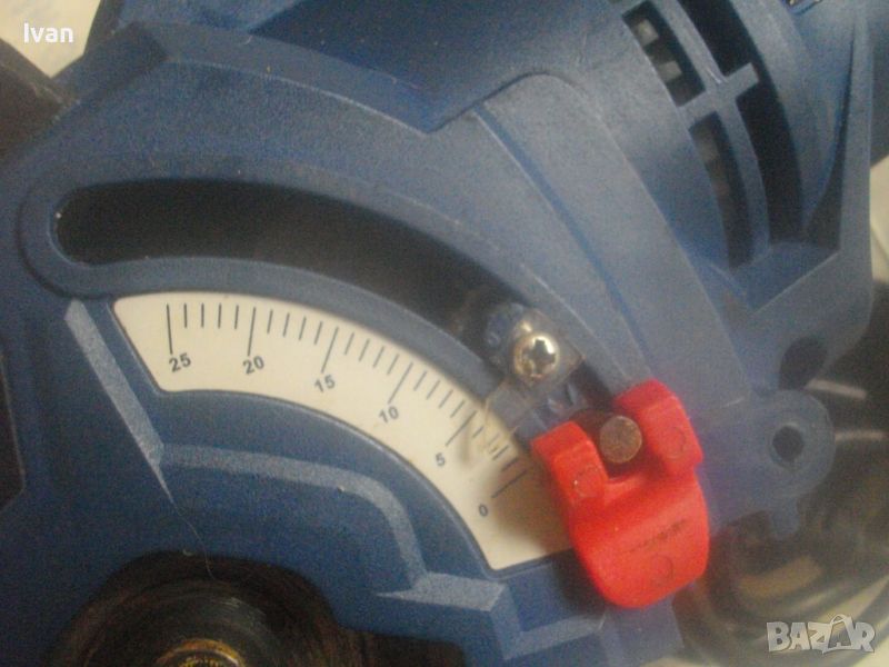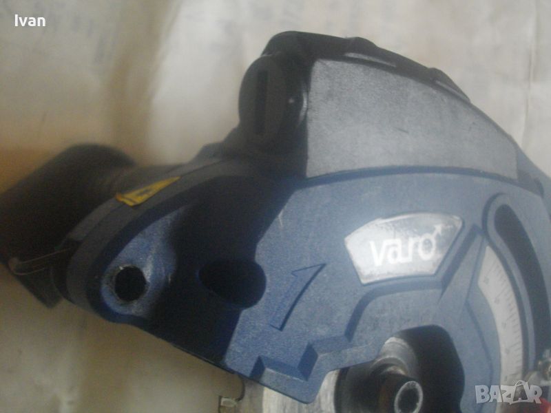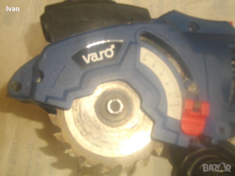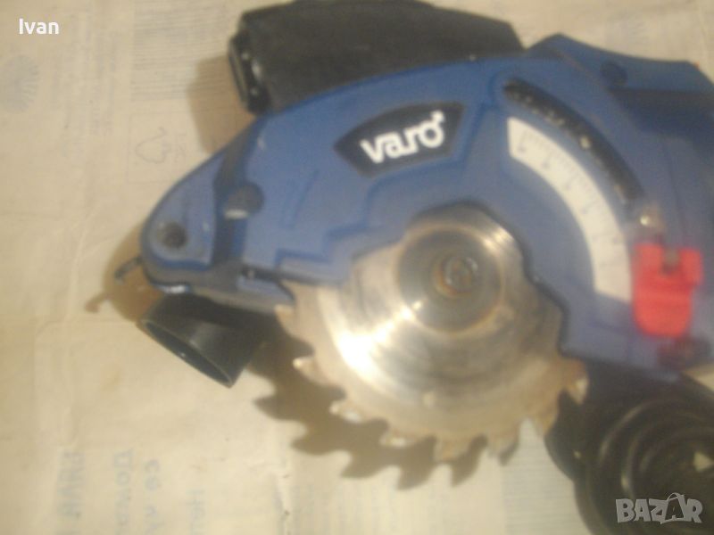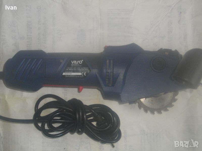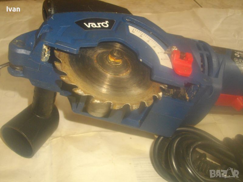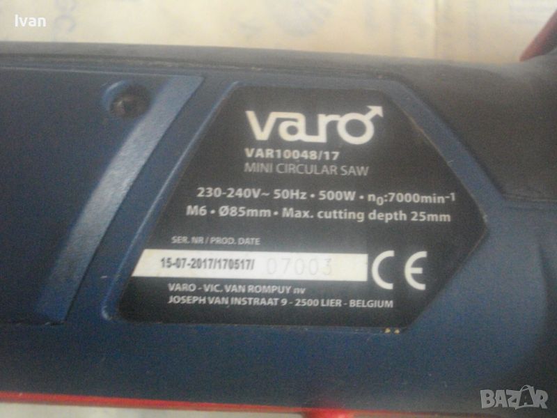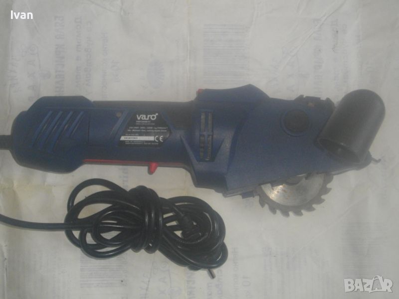 ОПИСАНИЕ на син ел. мини ръчен циркуляр - машина роторайзер - 199 лв. Белгийска оригинална професионална. Марка и модел - VARO VAR 10048 - Beigium. Произовдител маркиран - Joseph Van Instraat. Машината е със запазен външен вид и добро техническо/работно състояние. Мощност на мотора - 500 вата. За дискове размер ф 85 мм. Машината е с поставен оригинален режещ диск за дърво ф 85 мм. ЗАБЕЛЕЖКА - долния плот под диска на амшината е снет и липсва, за да може диска да реже по-голяма дебелина. При плот реже 25 мм, без плот в момента диска реже дебелина 35 мм. Машината е с лазер, чиято батерия липсва /батерията е голяма като на дистанционно за кола/. Долен дълъг спусък и горен пусков ключ. Гумирано покритие на корпуса при захвата на ръката. Машината е тип рязане с една ръка. Дължина на машината - 330 мм. Дълъг голям пластмасов конектор тръба за отвеждане на отпадъчния прах при работа в торба за прах или строителна прахосмукачка.