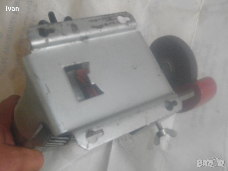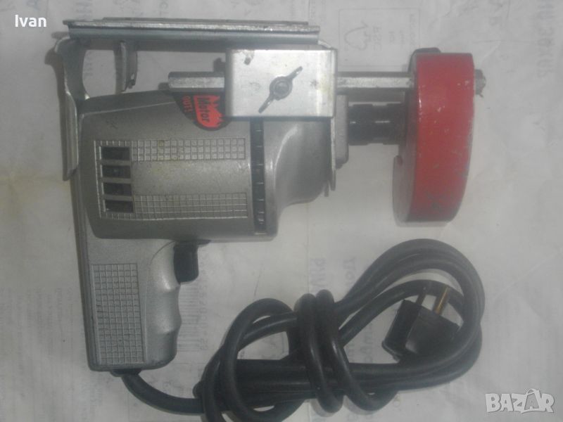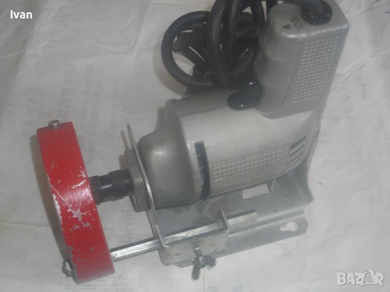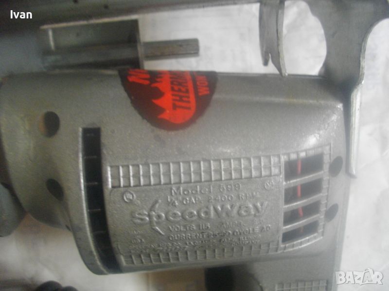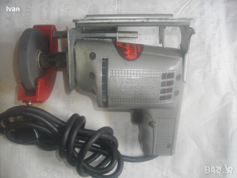 ОПИСАНИЕ на електрически мини шмиргел, работещ на 110 волта захранване. Цена 199 лв. НАЛИЧЕН. Съвсем нов, неизползван и неупотребяван. Висок клас оригинално САЩ производство, лимитирана серия. Марка и модел на машината - SPEED WAY Model 599 - Made in USA. Машината е със оригинален стикер за THERMOWELD MOTOR. Произовдител - THOR - USA. Представлява метална изцяло дреелка с поставена приставка шмиргел. Камъка на шмиргела е ф 80 мм с дебелина 10 мм - сив абразив. Скорост на машината - 2400 об/мин. Захват отпреед на оста - 1/4. Алуминиев предпазител над камъка и дълбочинен стоманен метален ограничител към предпазителя с регулация. Машината е на металната си оригинална стойка за обърнат стоеж, която е с 4 прореза на основата си, за захват към работна маса. Всичко по машината е метално без пластмасови елементи. Метален бутон на автостопа. Бакелит спусък. Гумирн трижеелине захранващ кабел. Щепсел - оригиналеен САЩ, с 3 букси. Машината в оригиналния си вид раоти на захранване 110-115 волта. Може да работи при захранване 220 волта, ако се включи към трансформатор от 110 към 220 волта.
