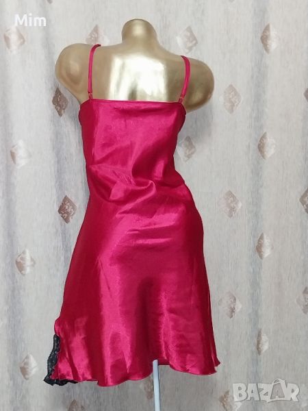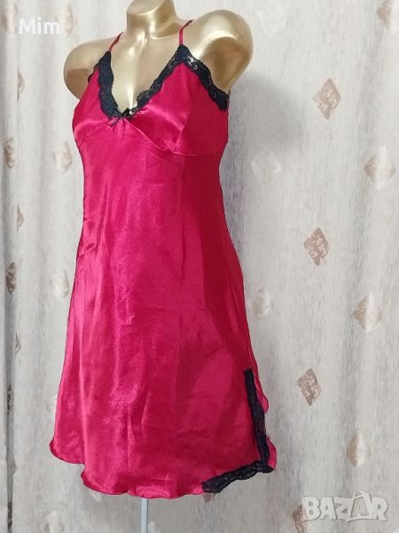 Червена сатенена нощница, регулируеми презрамки, мека чашка с черна дантела на бюста, странично с цепка с черна дантела, гръдна 56 см едностранно, ханш 58 до 63 см едностранно, дължина 98 см .Няма забележки