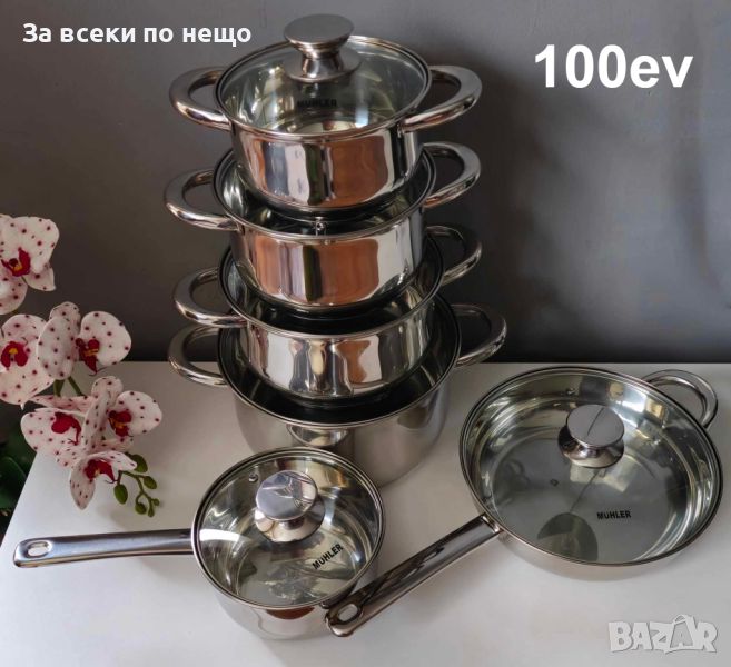 Висококачествена неръждаема стомана. Комплектът съдържа:/Касерола 16x9.5 cm - 1.6L, Тенджера 16x9.5 cm - 1.6L, Тенджера 18x10.5 cm - 2.2L, Тенджера 20x11.5 cm - 3.1L, Тенджера 24x13.5 cm - 5.4L,/Тиган 24x6.5 cm с капак - 2.1L/Дебелина на стената - 0.4мм/Трислойно капсуловано дъно за максимална топлопроводимост/Подходяща за газови, електрически, стъклокерамични, халогенни и индукционни котлони/Ненагряващи се дръжки/Стъклен капак/Подходяща за съдомиялна машина