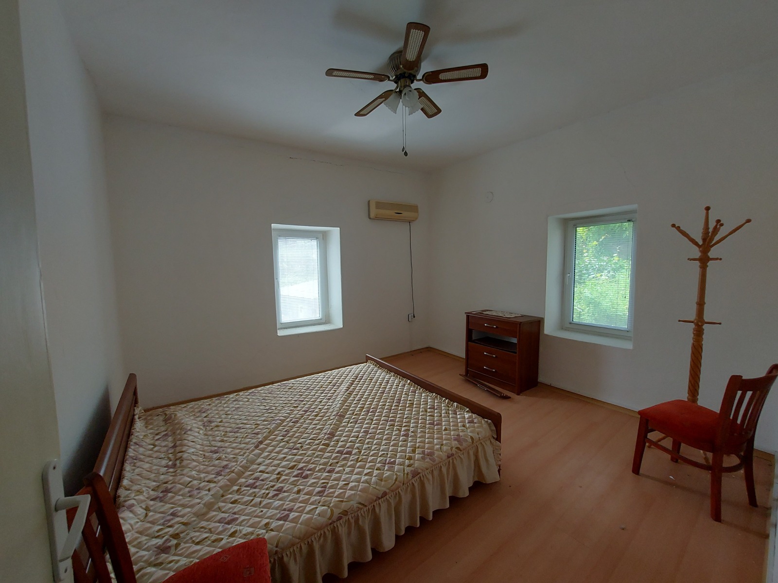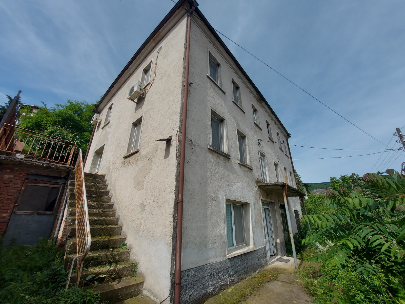 Прекрасно предложение на недвижимост с лице на две улици, които са с целогодишен достъп, оградено от всички страни. Предлагам ви два съседни парцела със ситуирана в тях къща близнак на калкан. Единият парцел е с площ 384кв.м., а другият 342кв.м., Общо 726кв.м. земя. Къщата е триетажна с общо РЗП 360кв.м., като във всеки парцел се пада застроена площ от 60кв.м. на три етажа + допълнителна постройка от 20кв.м. от едната страна. Къщата е стара каменна зидария без конструктивни деформации с два отделни входа отпред, и два отделни входа откъм двора. Покрива на цялата сграда е ремонтиран преди около 10год., по това време е ремонтирана и едната половина на къщата, другата част е подготвена за ремонт, като са изградени колони за уякостяване. Ремонтираната част представлява: първи етаж - хол с трапезария и кухня, мокро помещение-перално, тоалетна; втори етаж - 2 огромни спални; трети етаж - две огромни спални, тоалетна. Втората част на къщата е подготвена за реновация и дава възможност да се изпълни според вижданията на новият собственик. От всички етажи на къщата се разкрива хубава гледка. Имота е подходящ, както за лично ползване на голяма фамилия, така и за бизнес дейност. Задната част на двора, поради голямата си квадратура и денивелация дава възможност да се развихри въображението и да се изградят например барбекю чардак, площадка с басейн и пр. Отходните и дъждовните води са заустени в КАНАЛИЗАЦИЯ. Около къщата е изградена дренажна система, която също е заустена в канал.