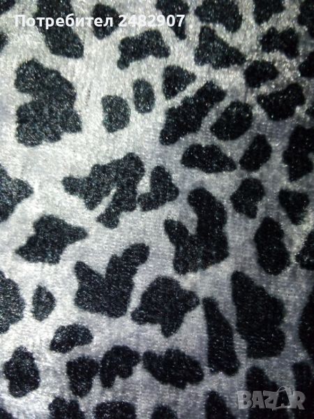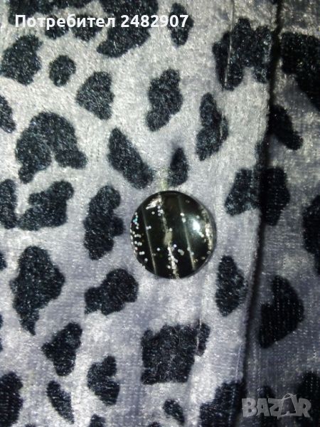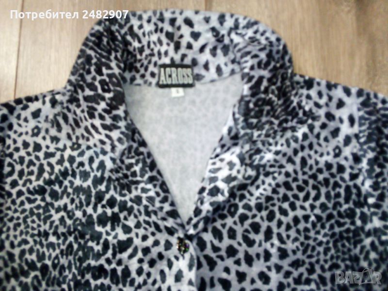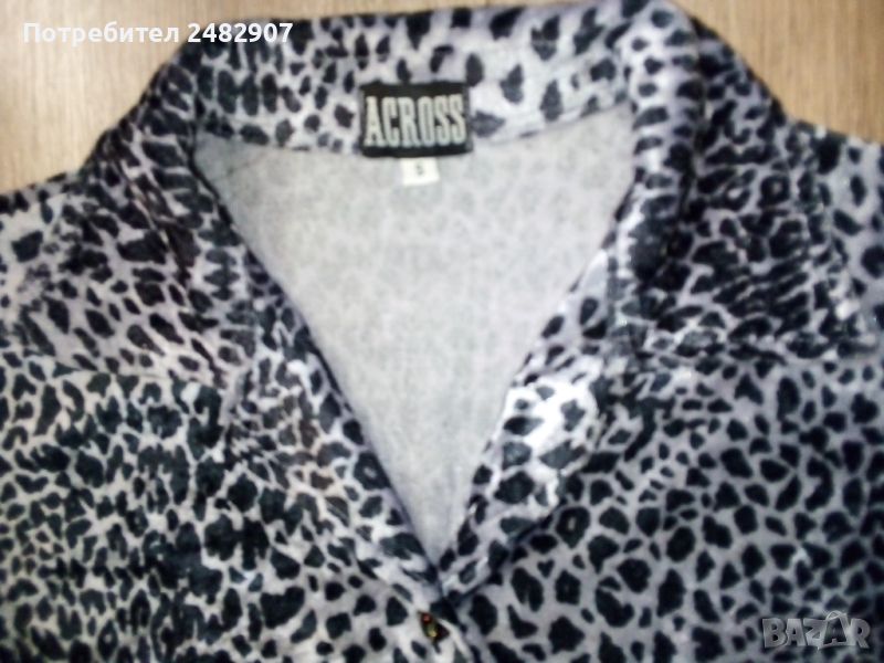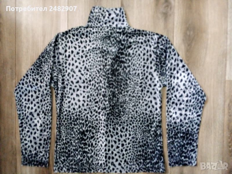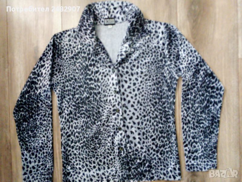 Дамска плюшена риза в сиво и черно с леопардов принт, размер S. Съдържа 100 % полиестер. Ширина в раменете - 37 см, ширина под мишниците - 44 см, ширина в долната част - 41 см, дължина от рамото до долу - 55 см, дължина на ръкава от рамото - 55 см, ширина на ръкава в долната част - 10,5 см. Много запазена, почти не е използвана, отлично състояние, без забележки, закопчаване - с 5 броя блестящи черни копчета.