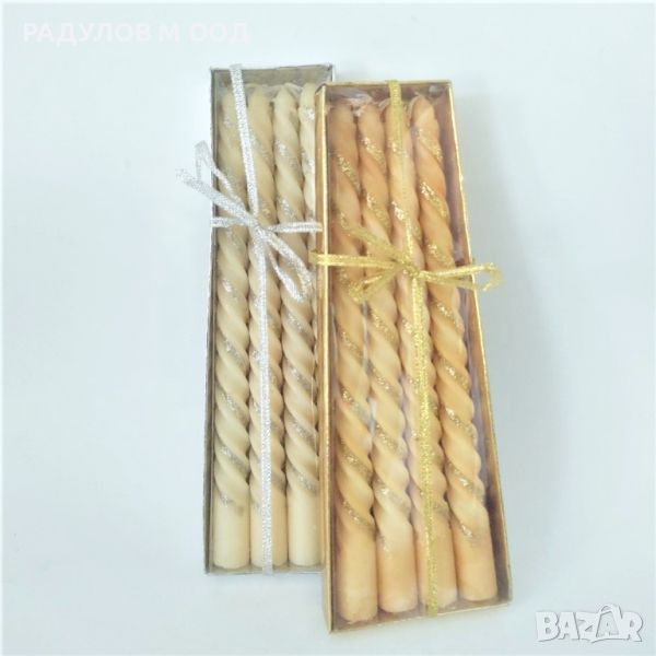 Свещите от този комплект са със спираловидна форма и имат брокат.