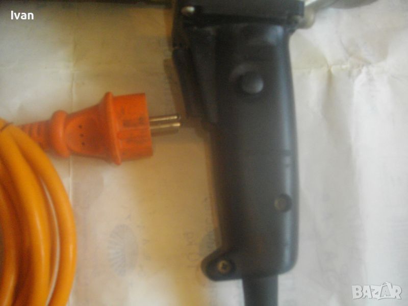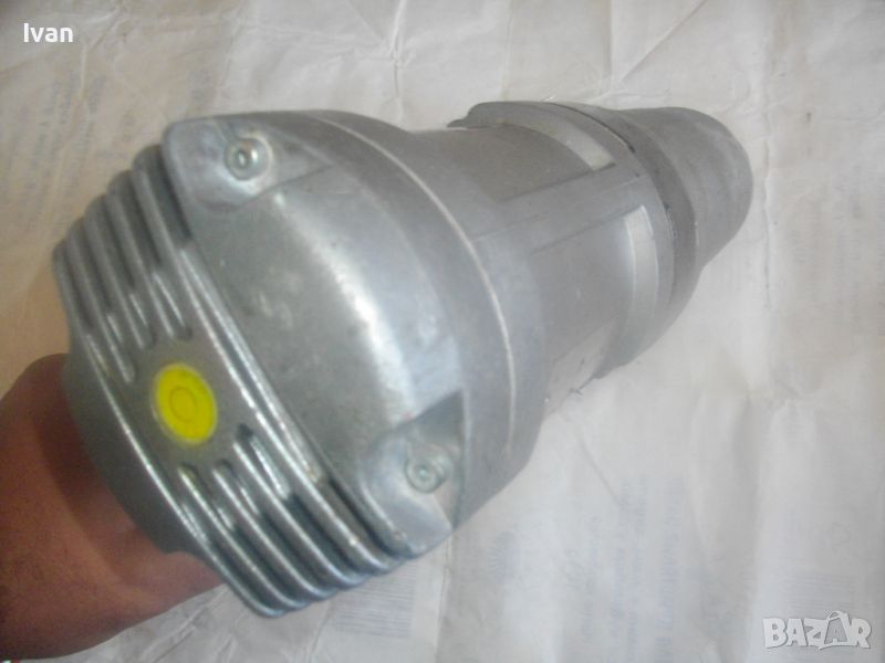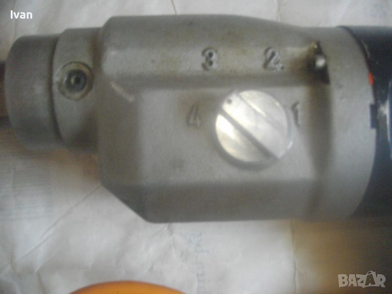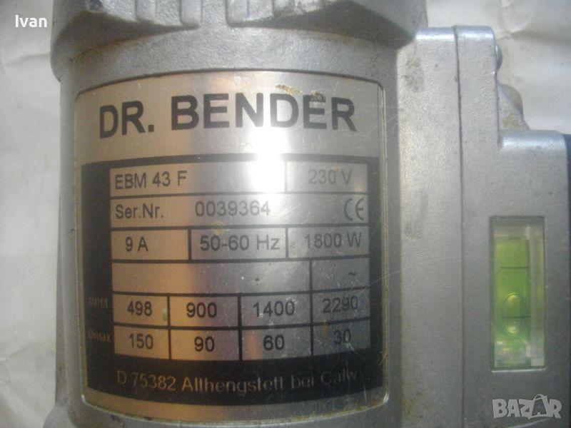 ОПИСАНИЕ на ел. диамантено пробивна машина - цена 999 лв. Почти нова, визулно много малко ползвана, като нова. В добро работно техническо състояние. Мощност 1800 вата, 4 скорости с обороти при различната скорост - ск1 - 498 об/мин, ск.2 - 900 об/мин, ск. 3 - 1400 об/мин. ск.4 - 2290 об/мин. Марка и модел на машината - Dr. Bender EB M 43 F. Характеристики - захранване - 230 V - 50-60 Hz - Защита 9 А /ампери/ - Мощност на мотора - 1800 W /Вата/. Пробив Ф макс при различната скорост - 150 - 90 - 60 - 30. Alihengstelt bei Calw. Вграден течен нивелир голям на дръжката, втори вграден малък кръгъл нивелир отзад на капака на корпуса. Автостоп на спусъка. Алуминиева задна част на корпуса, стоманена предна част, алуминиева капачка отзад. Клъч превключвател 4 скорости - метален. Отпред глава от закалена инструмента стомана с отвор ф 30 мм. Оригинален захранващ кабел с оригинален гумиран щепсел. На кабела тест защита с два бутона - Reset - Test и отделна светлинна индикация за претоварване на машината. Марка на тест защитата - ASS. Надписите на стикера с инструкции за употреба на машината са на немски език. Държина на машината - 46 см/дължина надолу с дръжката - 24 см, диаметър на машината ф 90 мм - ф 100 мм. Тегло на машината - 8,0 кг. Цена - 999 лв