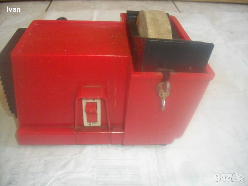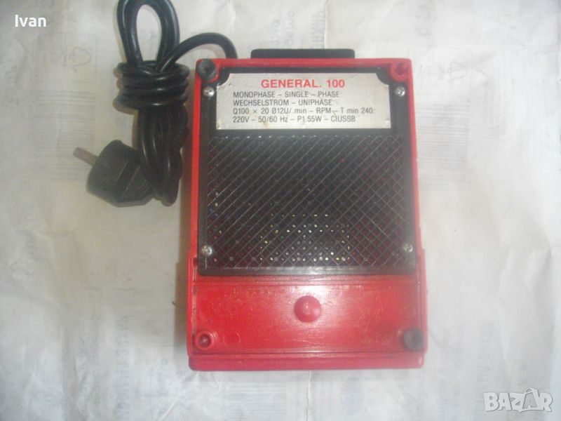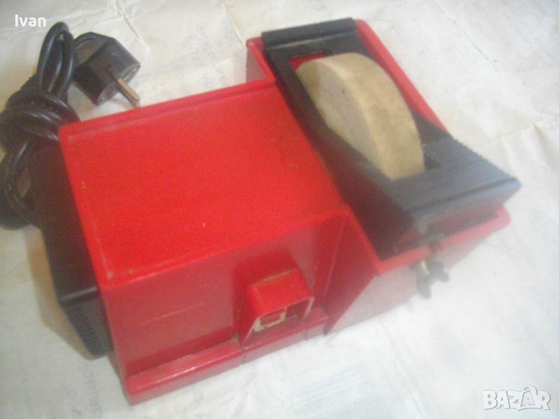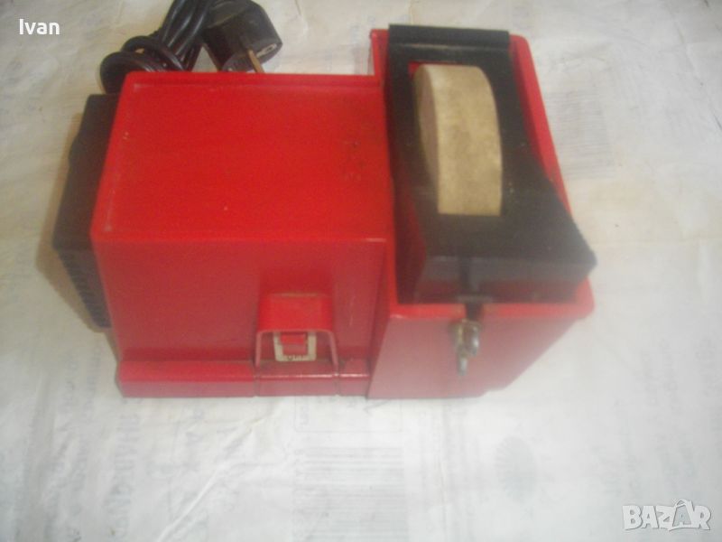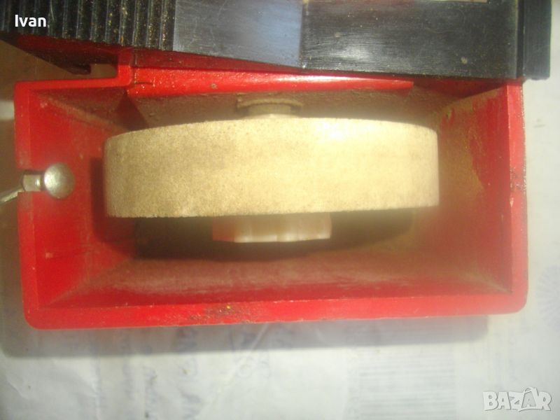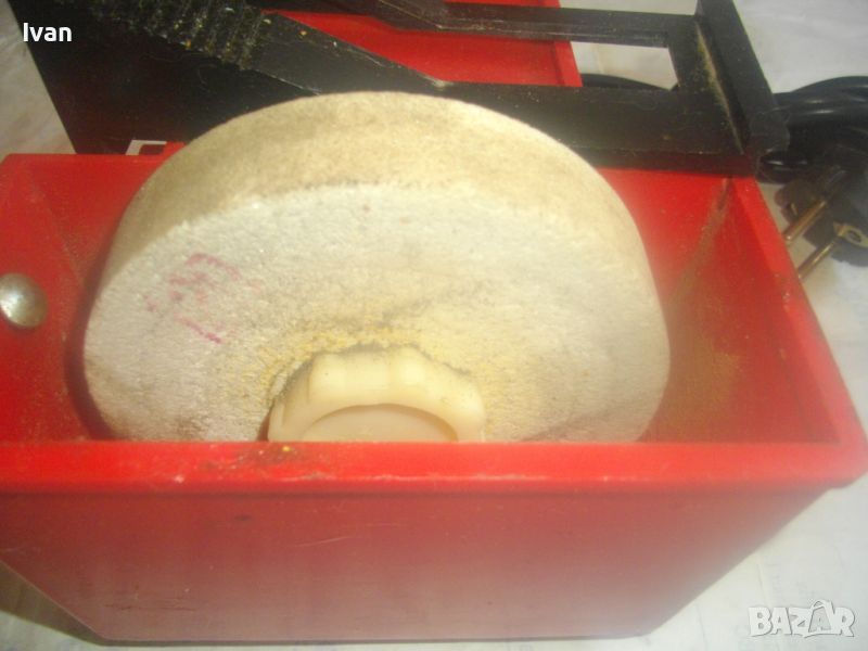 шмиргел с бял камък за водно заточване и шлайфане посредством бавна скорост - цена 199 лв. Машината е почти нова, като нова. В отлиично и безупречно работно, техническо и механично състояние. Марка и модел - General 100.Мощност на мотора - 55 вата, скорост - 240 об/мин. Гумирани крачета отдолу за стабилен стоеж. Вградена вана за вода с регулируем предпазител пред диска. Преден пусков ключ ON-OFF. Точилото шмиргел е с поставен оригинален бял камък диск мека пясъчна абразивна зърненост, с размер външен ф 100 мм, в отлично състояние. Машината е за дискове камъни шлифовъчни размер ф 100 х 20 х 12 мм.Захранване 220 волта/50-60 Херца. Размери на машината - дължина 190 мм, ширина 135 мм, височина 125 мм.Тегло - 2,0 кг. Цена на водния шмиргел 55 вата/ф 100 мм - 199 лв.