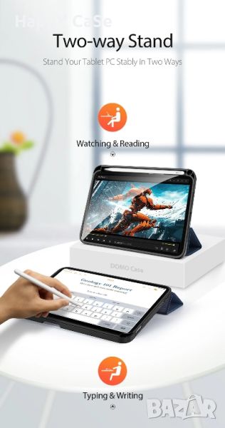 3. Тройно прегъващ се капак, който оформя пирамида на която таблета да се обляга в две позиции за гледане на видео и за писане.