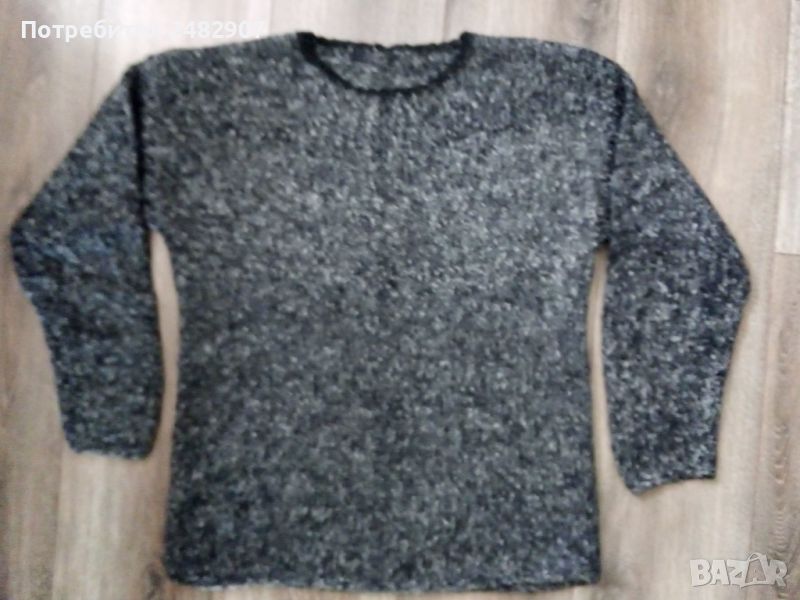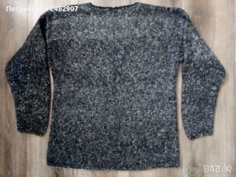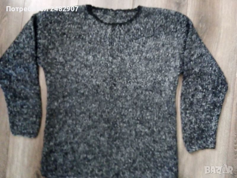 Ръчно изплетена дамска блуза, цвят - черен меланж. Ширина в раменете - 53 см, ширина под мишниците - 49 см, ширина в долната част - 50 см, дължина от рамото до долу - 62 см, дължина на ръкава от рамото - 49 см, ширина на ръкава в долната част - 10 см. Много запазена, почти не е използвана.