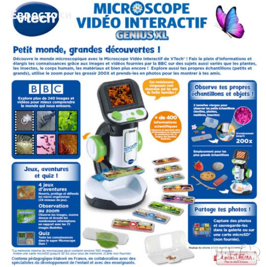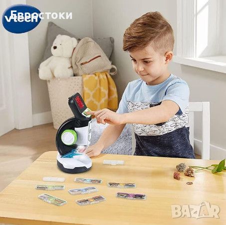 Открийте микро света през очите на вашето дете. Позволете на вашето дете възможността да се потопи в магическия свят на микроорганизмите с интерактивния видео микроскоп VTech. Предоставени са материали, включително снимки и видеоклипове от BBC. С тях вашето дете може да научи за разнообразни теми - от растения до човешкото тяло и материали. Вашето дете може да проучва свои собствени проби, увеличава изображенията до 200 пъти и споделя откритията си с приятели.