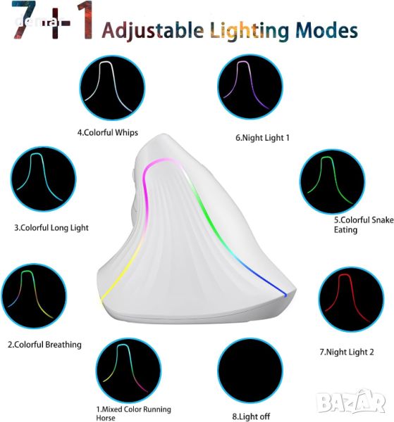 Тази ергономична мишка разполага с удобен захват за намаляване на мускулната болка от продължителна употреба, с удължен дизайн на "рампа", който минимизира триенето на китката и предотвратява потъмняването на кожата. Предлага 8 регулируеми режима на осветление, бутон за регулиране на светлината и три канала за безжична връзка (безжичен USB, Bluetooth 1, Bluetooth 2) за множество устройства. С точен 4-степенен DPI (1000-1600-2400-4000) и безшумни бутони, той осигурява изживяване без смущения както при работа, така и при игри. Съвместим с настолни компютри, лаптопи, MacBook, iPad и телефони в различни операционни системи (Windows, MacOS, iOS, Android, Linux, Chrome OS), той разполага с порт за зареждане Type-C, осигуряващ 60 дни употреба за два часа зареждане при изключена светлина и пет дни при включена светлина, включително кабел за зареждане.