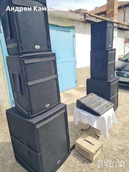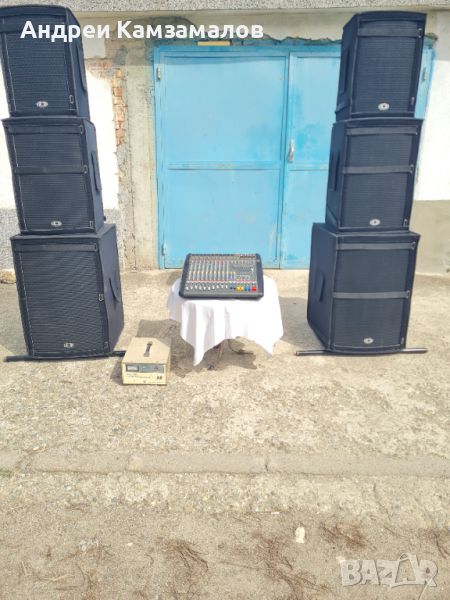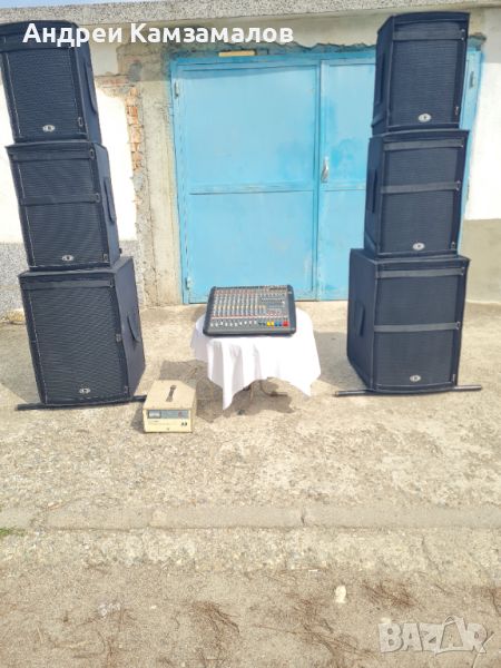 Динакорд Повер миксер1000 - 3 модел /2 по 1000 вата на канал/. 6 колони на Динакорд - 2 баси 18 ски, 2 топа 15ски и 2 топа 12ски.Всички колони се захранват от миксера и работят идеално на 2,6 Ома. Миксера и колоните са като нови,на броени участия и се продават с поръчкови калъфи,които ги пазят при транспорт. За по-вече информация на телефон 00359 899 11 85 67-Аидън.