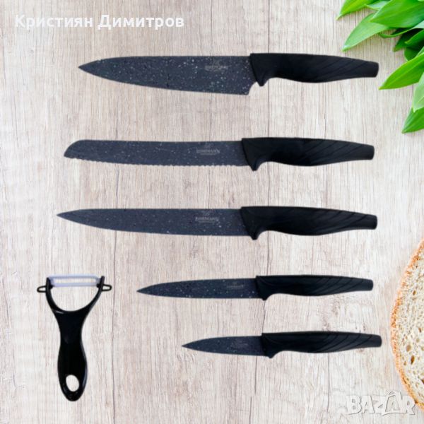 - Висококачествена изработка и материали - Ергономични дръжки за удобство при използване - Лесни за почистваане - Мраморно незалепващо покритие - Съдържание на комплекта: Готварски н о ж: 20 см Н о ж за рязане: 20 см Н о ж за хляб: 20 см Универсален нож: 12.7 см Н о ж за белене: 8.89 см Белачка с керамично острие
