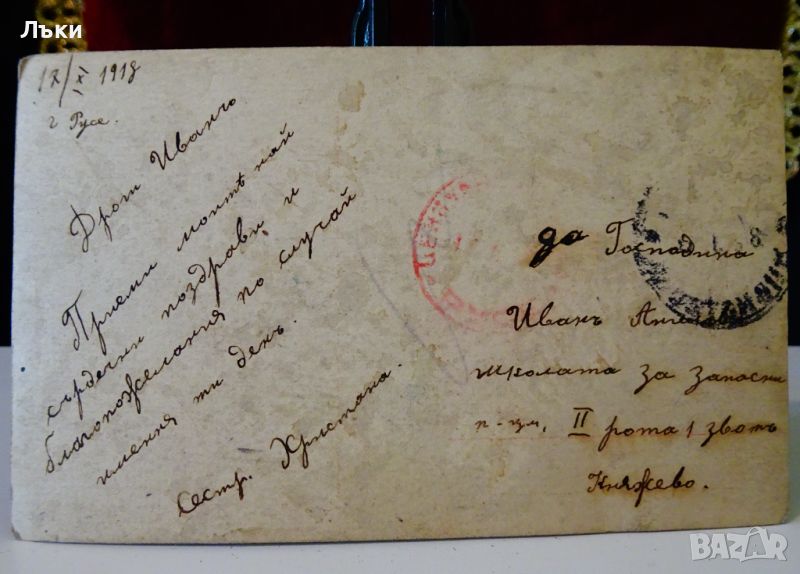 Царство България,дебел картон.Пътувала до Школа за запасни подпоручици,втора рота,първи звод с.Княжево. Червен печат на военна цензурна комисия.