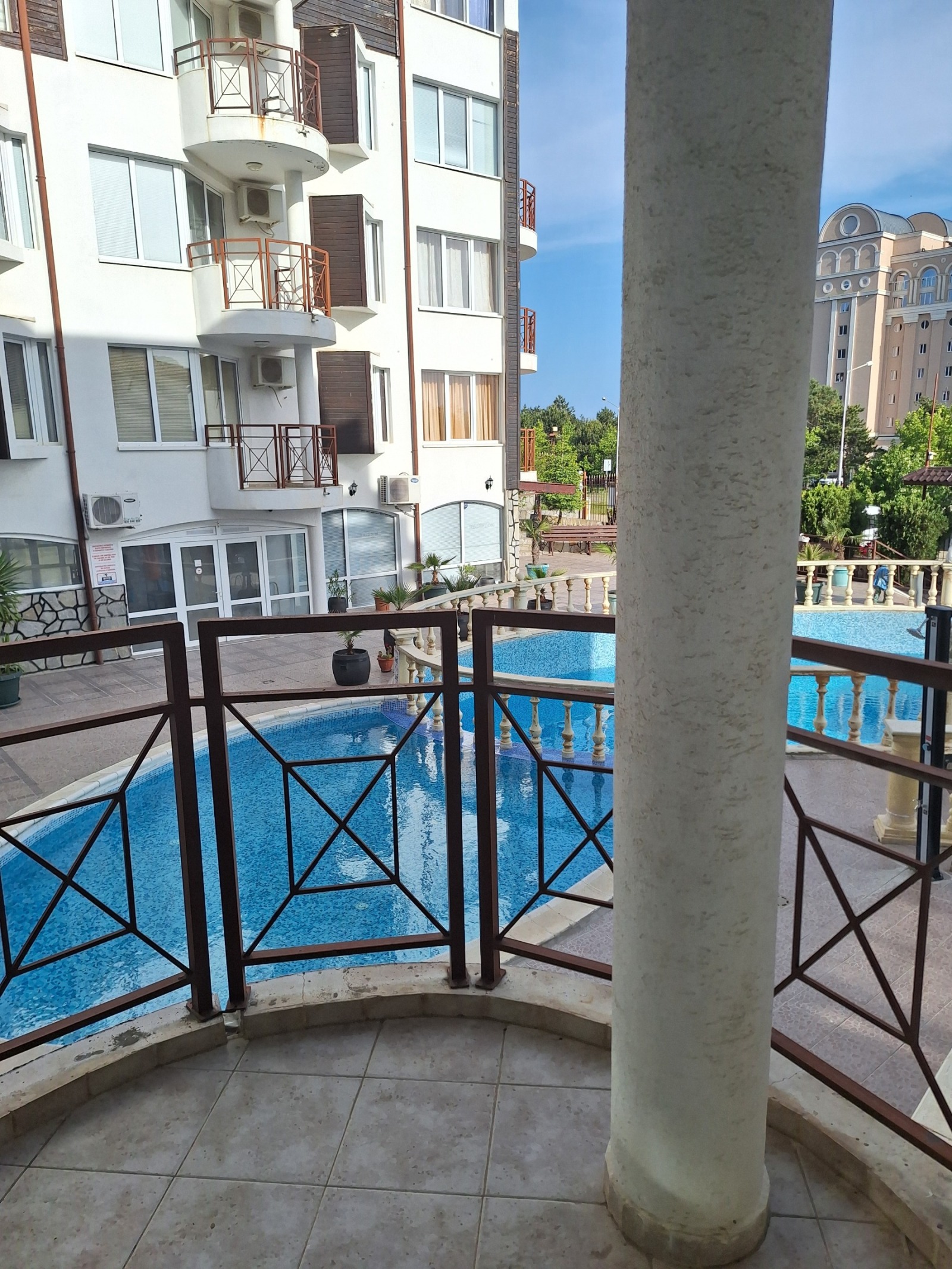 ЛУКСОЗЕН КОМПЛЕКС!!! Комплексът е разположен в благоустроен район в началото на Св. Влас. На пешеходно разстояние има супермаркет, магазини, заведения, автобусна спирка. Комплексът е с контролиран достъп и охрана! Плажа е на 400м. Района е много тих и спокоен и с много зеленина. На територията има басейни, места за паркиране, ресторант, и прекрасен скайбар с красива морска панорама! Апартамента е разположен е на 5 жилещен етаж. Състои се от антре, хол голяма спалня, баня с тоалетна, и голяма тераса с красива панорама . Всичките мебели в апартамента са качествени и запазени! Имотът е подходящ за целогодишно ползване, както и за отдаване под наем през летният сезон. Разполагаме с над 200 ап. от Елените до Лозенец.