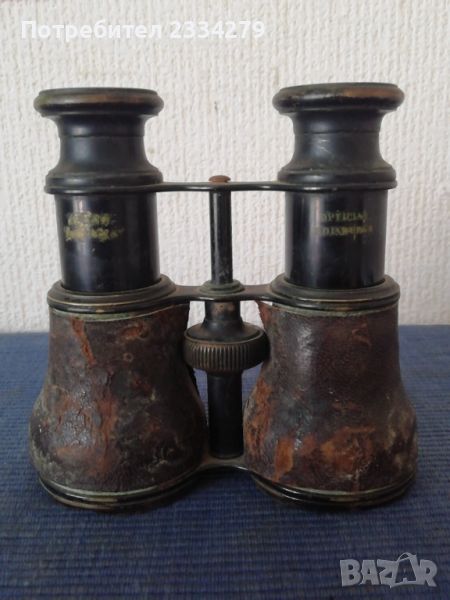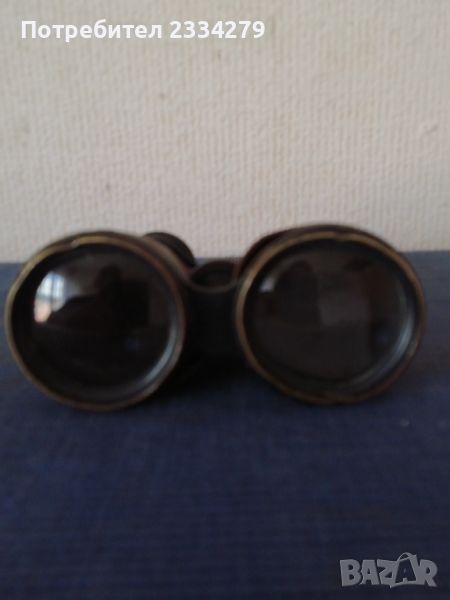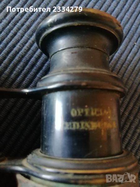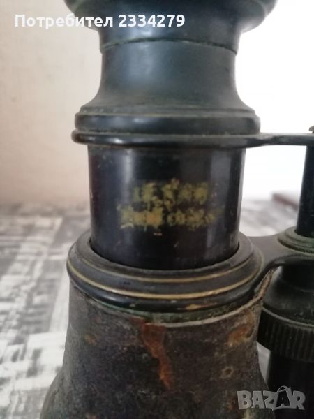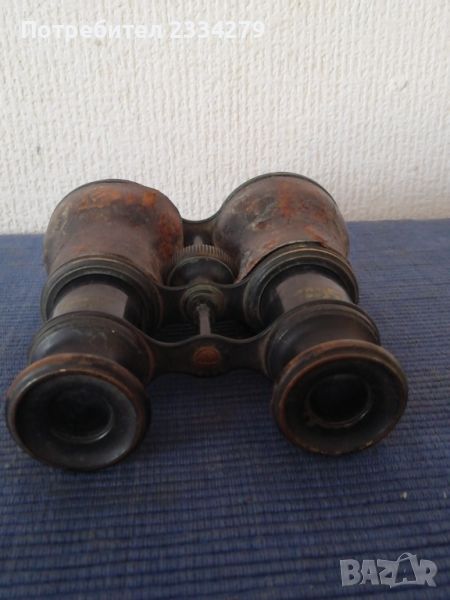 Стари военни предмети: Артилерийска тръба от Английска кралска артилерия. Запазена сигнална - ,тръба изработена от мед има и емблема от бронз,,THE FRONTILA FORCE REGINA. HONI*SOTT*RUI MRAFOR PENZE". N2 Бинокъл стара изработка от бронз-месинг облечен в кожа,запазен ползваем.