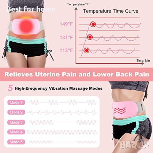 3 температури на нагряване и 3 режима на масаж: Можете да регулирате температурата според вашите действителни нужди, които са удобни за вашия менструален цикъл, стомаха и мускулите. The Heating Pads for Cramps е нещо повече от просто нагревателна подложка, но е и устройство за масаж, което ви позволява да изберете подходящия за вас режим на вибрация и ви осигурява комфортно масажно изживяване. Можете да изберете по-ниска температура за удобно приложение на топлина или по-висока температура за по-силно облекчаване на болката.