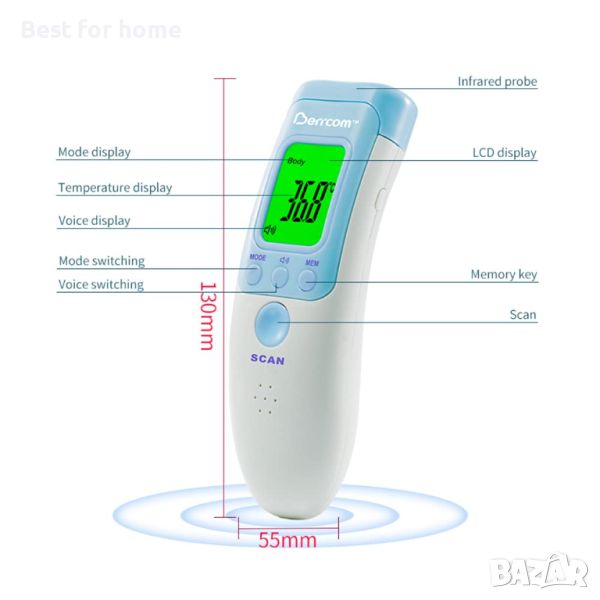- За измерване на телесна температура, повърхности (бебешка бутилка, вана) и обкръжение.