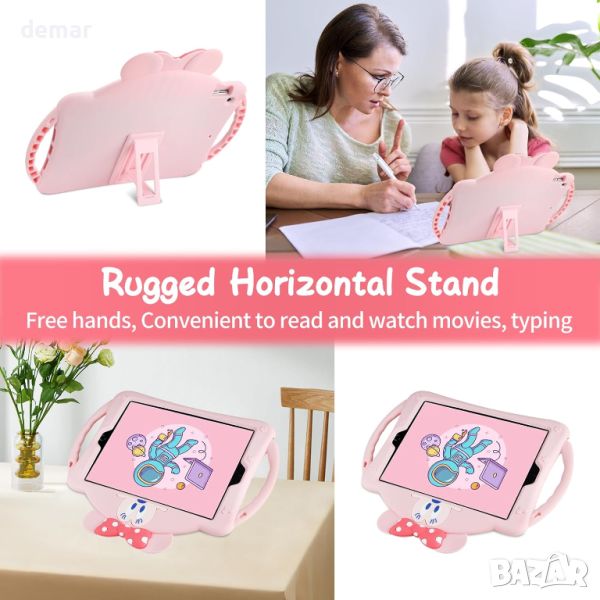 Този калъф за iPad е предназначен за iPad от 9-то, 8-мо и 7-мо поколение (10,2 инча) с модели A2602, A2603, A2604, A2605, A2270, A2428, A2429, A2430, A2197, A2198 и A2200. Включва протектор за екрана от закалено стъкло за защита от удари, прах, драскотини и удари. Изработен от висококачествен, удобен за деца силикон, той разполага с подвижна и регулируема презрамка, идеална за деца и пътуване. Калъфът има и регулируема стойка за удобни ъгли на гледане и рисуване. Прецизните изрези позволяват лесен достъп до всички бутони и портове и е нетоксичен, пере се и лесен за инсталиране и премахване, без да е необходимо да сваляте кутията за зареждане.