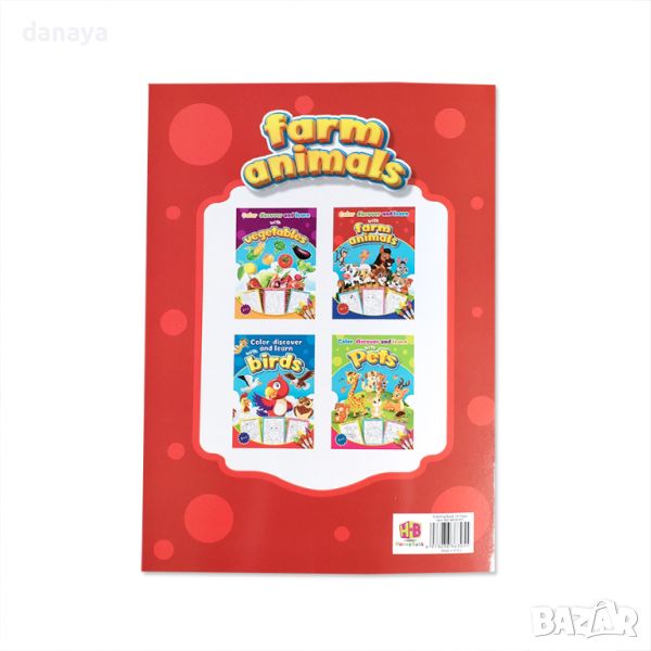 Детска книжка за оцветяване Color Discover and Learn. Книжка за оцветяване по номера на различна тематика – Живорните във фермата, Зеленчуци, Птици и домашни любимци. Книжката е подходяща за малки деца, които обичат да оцветяват и рисуват. Всяка картинка е разграфена по номера и всеки номер си има цвят. Детето трябва да оцвети страниците, следвайки цветния код и пред очите му ще оживеят великолепни картини.