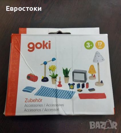 Комплект аксесоари за куклена къща Goki включва: телевизор, саксии, книги, лампи, будилник и други кукленски вещи. Общо 17 различни аксесоара, изработени от дърво. Детенцето може да ги нареди както желае и да започне весела игра.