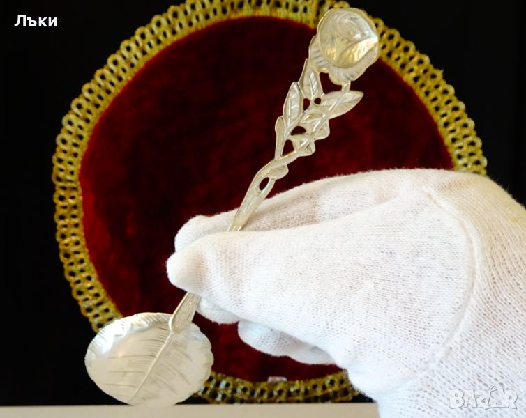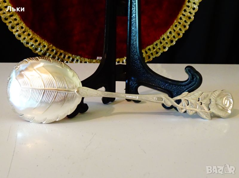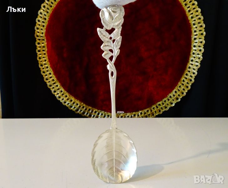 серия,цялата лъжица има релеф на роза – листо,стъбло и цвят.Дължина 16 см.,ширина