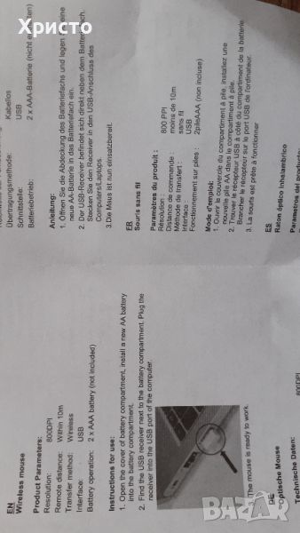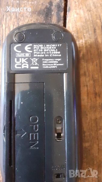 Продавам безжична мишка wireless, цвят черен, пластмаса гланц. Работи с 2 батерии ААА, които не са включени в цената, разстояние 10 метра, резолюция 800 dpi. Внос от Холандия. Чисто нова, не е ползвана. Размер 11,5х5,5х2 см височина в най-дебелата част.