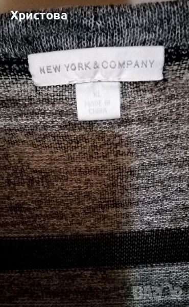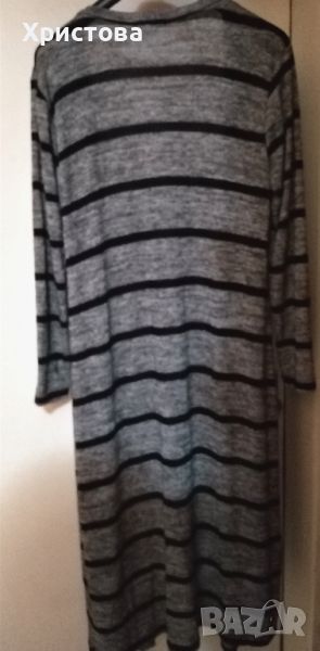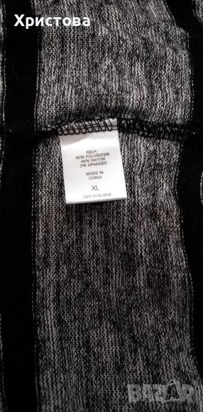 Дълга жилетка от фин машинен трикотаж(52% POLYESTER, 46% RAYON, 2% SPANDEX), сив меланж с черно и хоризонтални черни райета, с два джоба отпред, без закопчаване. Размер по етикет XL.