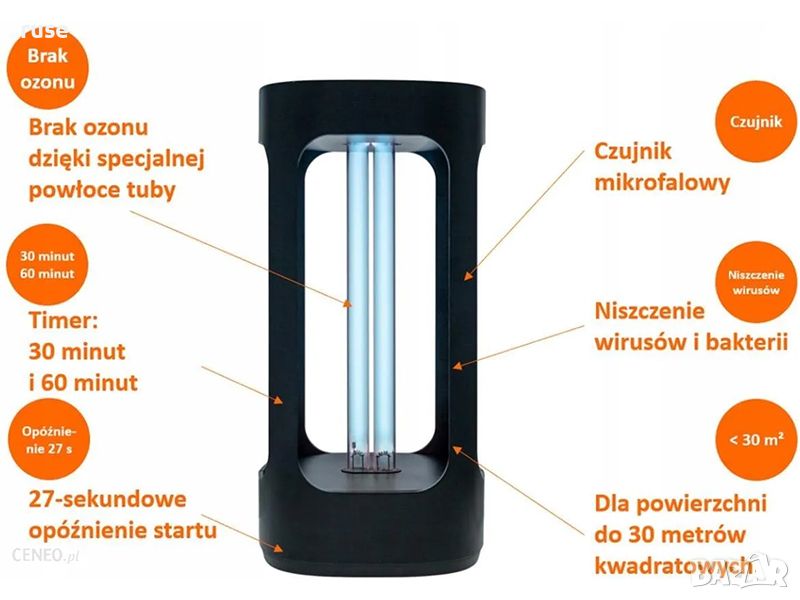 Дезинфекцира площ до 30m2 за време от 30 или 60 min с вграден таймер за действие.