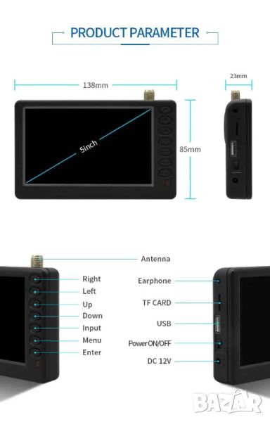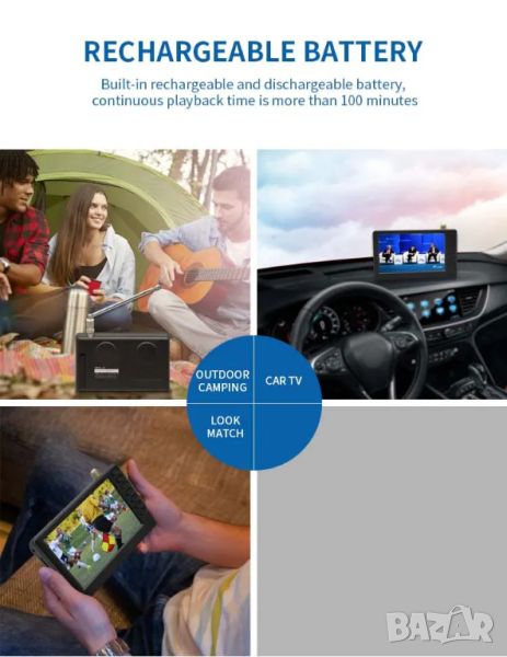 Портативен, висококач9ствен телевизор 5 инча с цифров тунер и вградена акумулаторна батерия, перфектна кристална картина на супер промоционална цена.