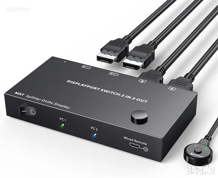 DisplayPort Splitter Switch 4K@60Hz, 2 in 2 out MST SST DisplayPort Splitter for 2 Computer Switch to 2 Monitors, кабелно дистанционно управление и USB захранващ кабел са включени