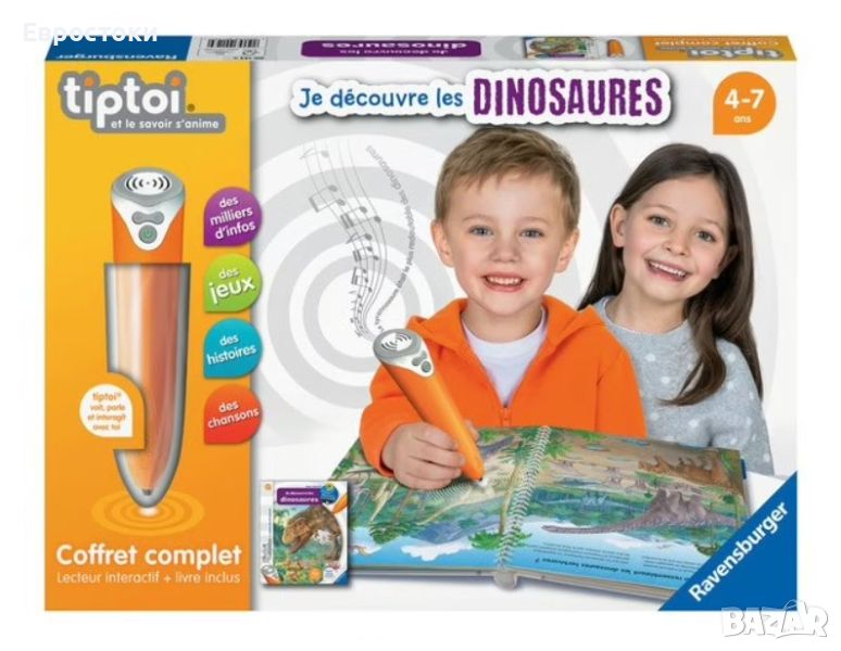 Ravensburger - tiptoi® - Complete Box Interactive Reader + Book Интерактивна образователна игра + четец „Аз откривам динозаври“, От 4 години - Френска версия книга