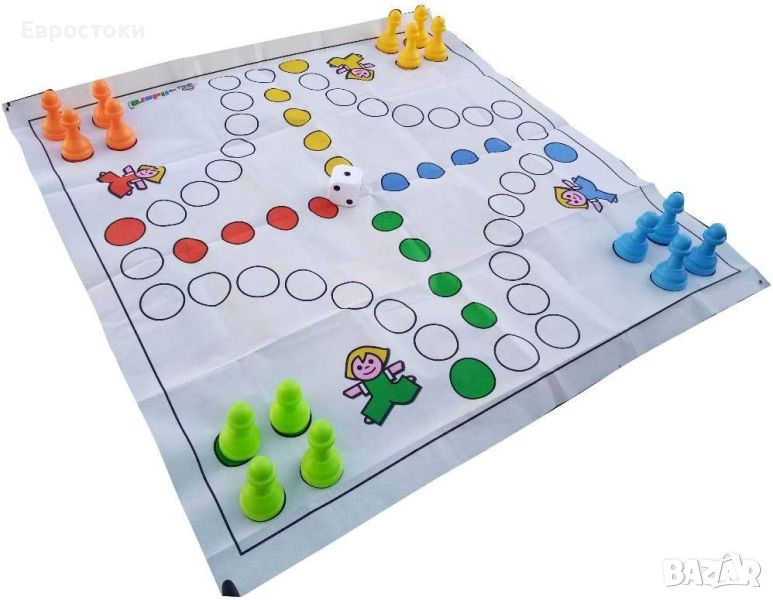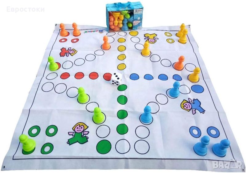 Страхотна игра на Лудо за закрито и открито. Постелка за игра 1,50 м х 1,50 м, височина на фигурите прибл. 13,5 см, куб 8 х 8 см.