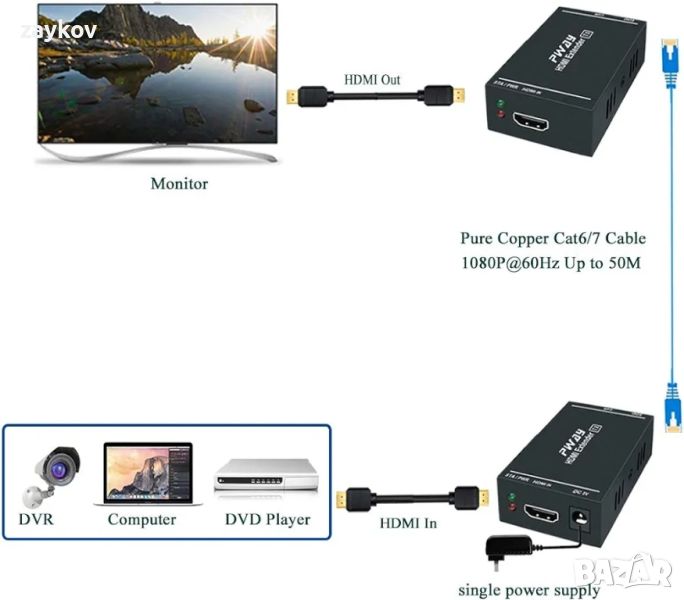PWAY 1080p 60Hz 3D HDMI удължител през единичен кабел Cat5e/Cat6/Cat 7, Full HD